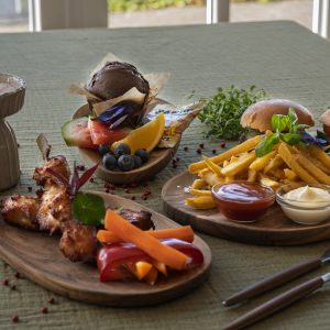 Rodfrugtchips med vintertrøffelcreme, syltet artiskok og Vesterhavsost.